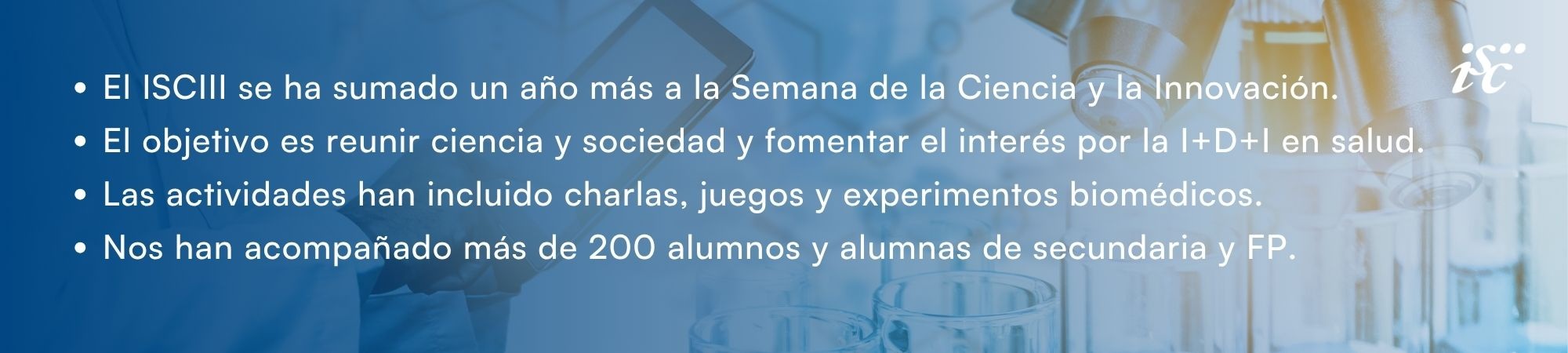 El Instituto de Salud Carlos III (ISCIII) se ha volcado un año más con la celebración de la Semana de la Ciencia y la Innovación, una iniciativa de divulgación y cultura científica cuyo objetivo es llevar la ciencia a la sociedad y fomentar el conocimiento y la participación activa del ciudadano en la práctica científica.