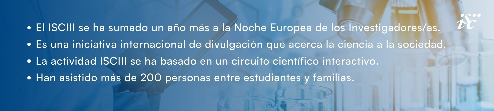 El Instituto de salud Carlos III (ISCIII) se ha sumado un año más a las actividades de divulgación científica en el marco de la Noche. Como actividad principal, el ISCIII ha organizado el viernes 26 en su Campus de Majadahonda, en Madrid, un circuito científico abierto a todo tipo de público, en espacios exteriores e interiores, en el que las personas asistentes han conocido a nuestros científicos y científicas, visitado laboratorios, realizado pequeños experimentos y aprendido sobre varias de las líneas de investigación del Instituto.