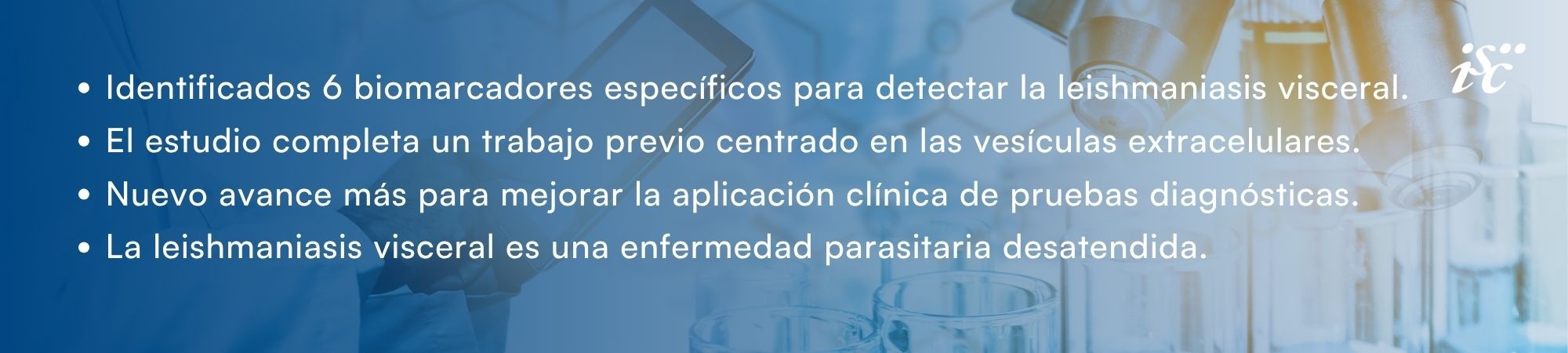 El análisis de las EVs procedentes de suero de pacientes con LV permitió la identificación de 132 proteínas humanas diferencialmente expresadas entre pacientes activos -con enfermedad pero sin tratamiento- y tratados. Posteriores pruebas validaron mediante el test ELISA seis biomarcadores específicamente candidatos para detectar la leishmaniasis visceral. Entre ellos, destaca la detección de la proteína amiloide sérica A1 (SAA1), característica de la fase aguda de la enfermedad y cuya expresión disminuyó significativamente un mes después del tratamiento en pacientes afectados de la enfermedad.