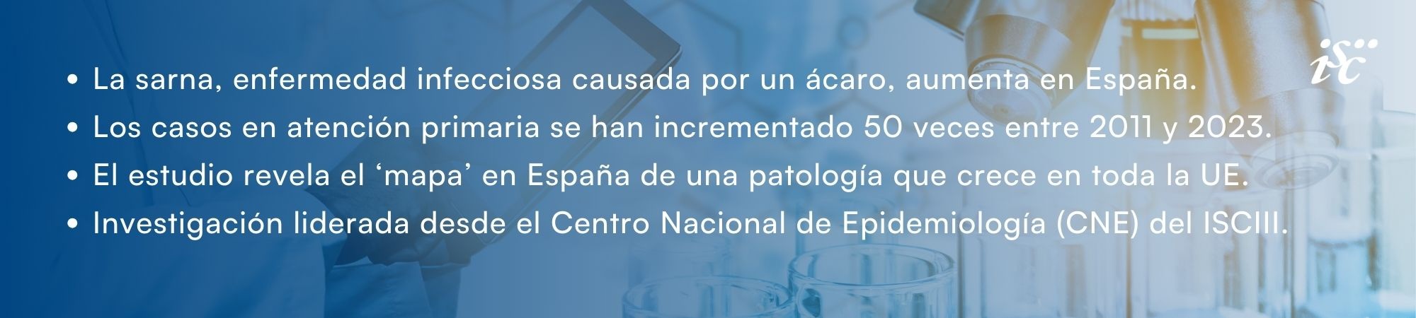 • Referencia del artículo: Chatterjee Allegra, Roy Álvaro, García-Blázquez Cristina, Cruz Israel, Gómez-Barroso Diana, Descalzo Miguel Ángel, Planelló Rosario, Herrador Zaida, SCABEAT Network group. Rising scabies incidence in Spain: a retrospective observational analysis of four national data sources, 2011 to 2023. Euro Surveill. 2025;30(47):pii=2500296. https://doi.org/10.2807/1560-7917.ES.2025.30.47.2500296.
