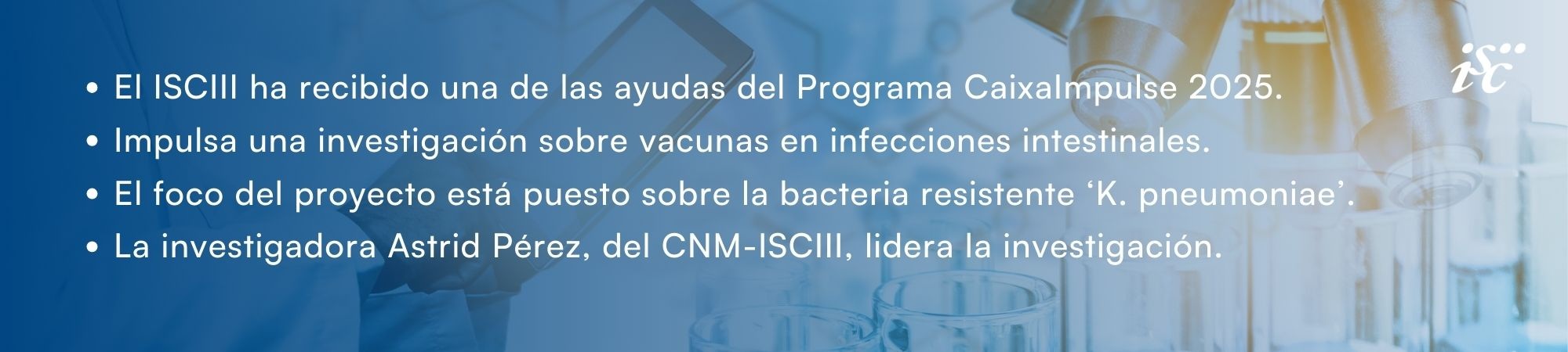 La Fundación la Caixa ha resuelto este martes la convocatoria 2025 de su Programa CaixaImpulse, y una de las ayudas ha sido concedida a un proyecto de investigación desarrollado en el Instituto de Salud Carlos III (ISCIII), liderado por la científica Astrid Pérez en el Centro Nacional de Microbiología (CNM). Los 50.000 euros de esta ayuda ayudarán a impulsar una línea de investigación sobre vacunas para infecciones intestinales causadas por la bacteria Klebsiella Pneumoniae.